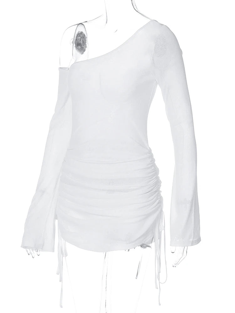 Dulzura Solid Skew Collar Ruched Straps Lace-Up See Through Draw String Mini Dress 2023 Summer Women Party Clubwear Wholesale