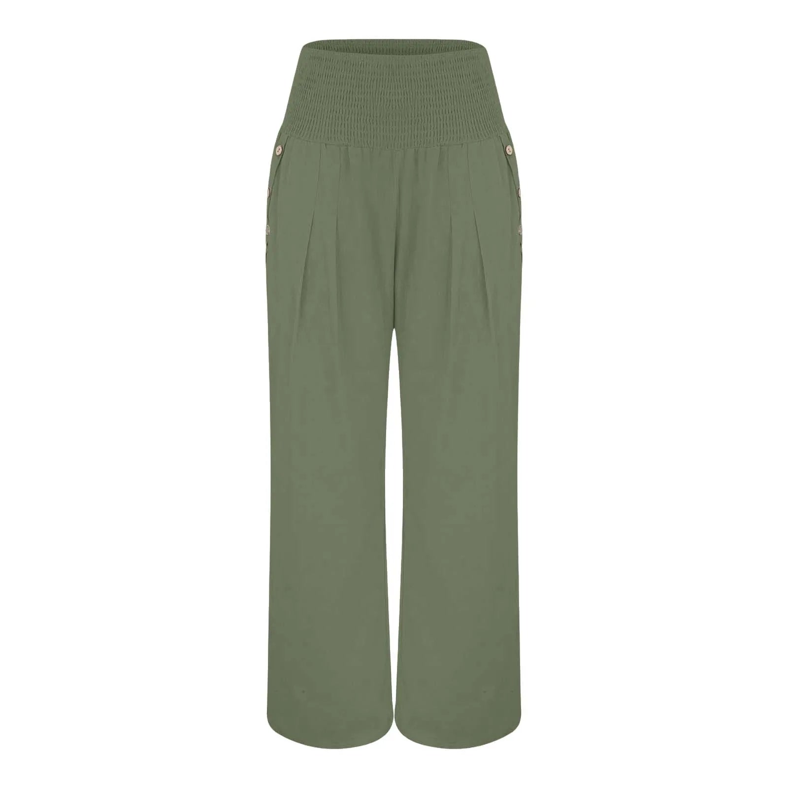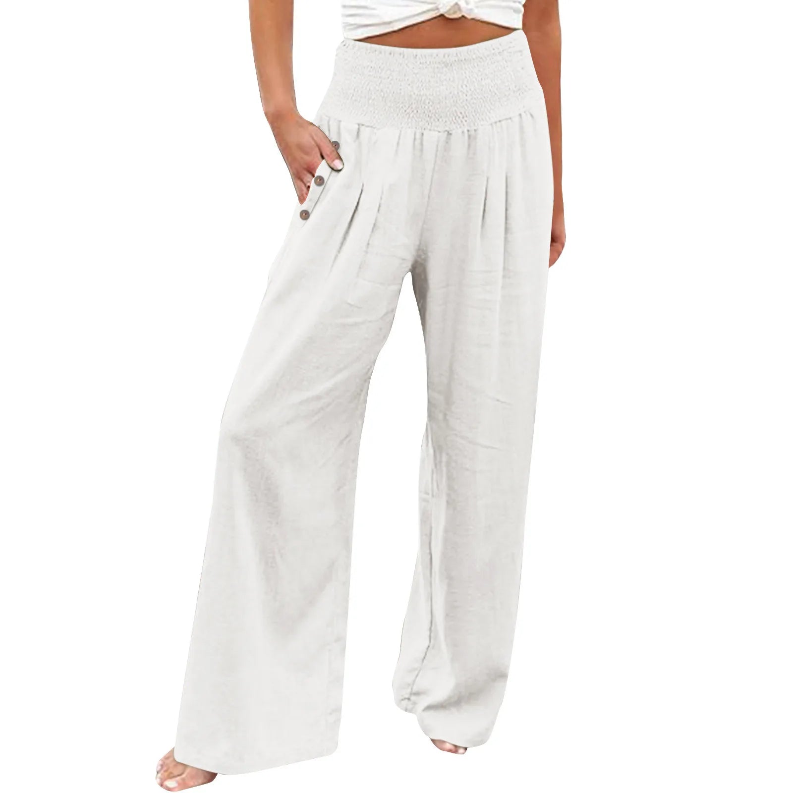 Fashion Cotton Linen Pants Women's Elastic High Waist Loose Wide Leg Pants With Pockets Solid Color Pleated Yoga Sports Pants
