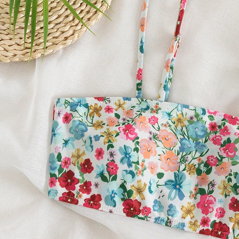 Floral Print Bandeau Bikini Set Off Shoulder Push Up Swimsuit Women Tube Top Bikinis Knot Swimwear 2024 Sexy Summer Bathing Suit