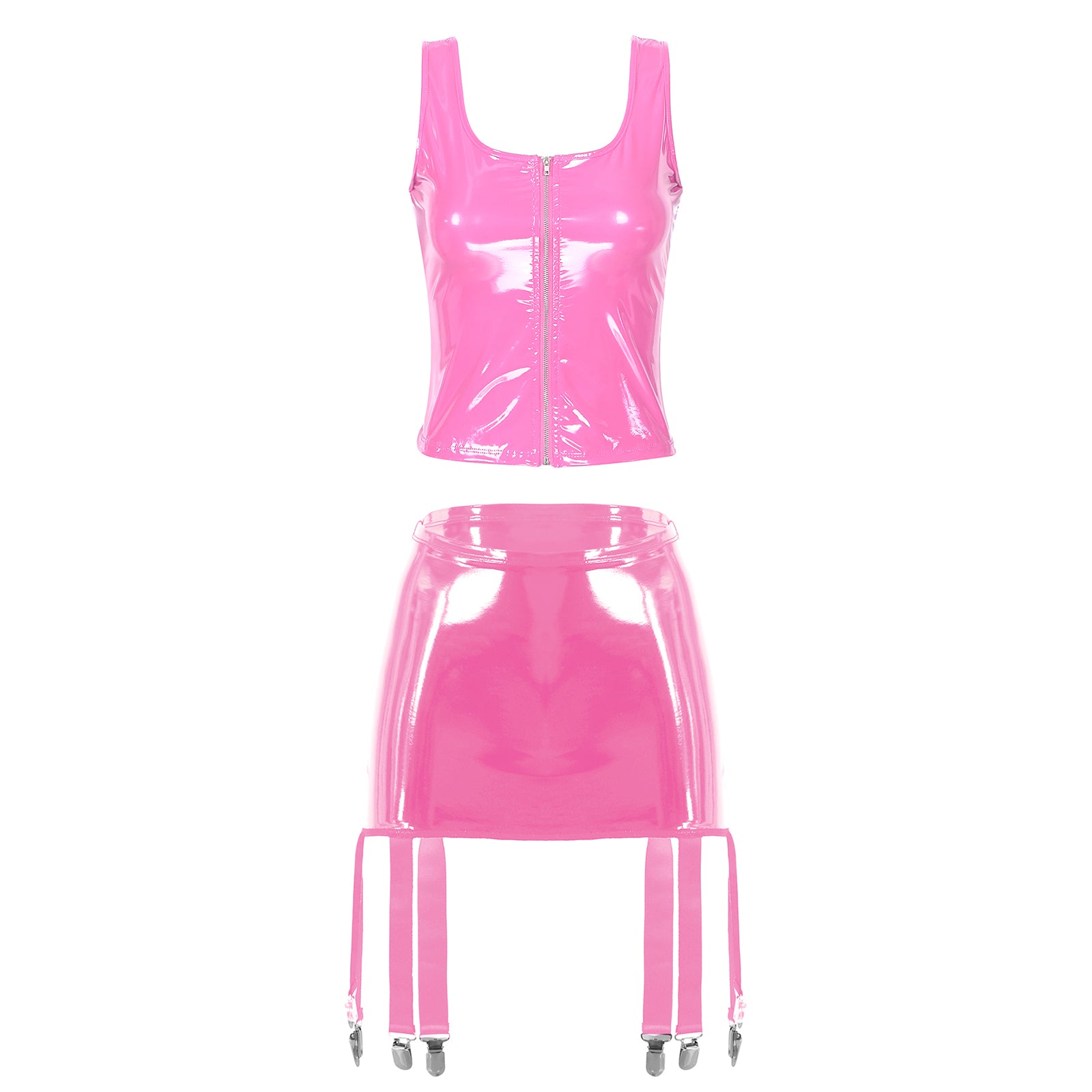 Womens Wet Look Patent Leather Lingerie Two Piece Set U Neck Zipper Tank Top with High Waist Garter Skirt Club Party Costume